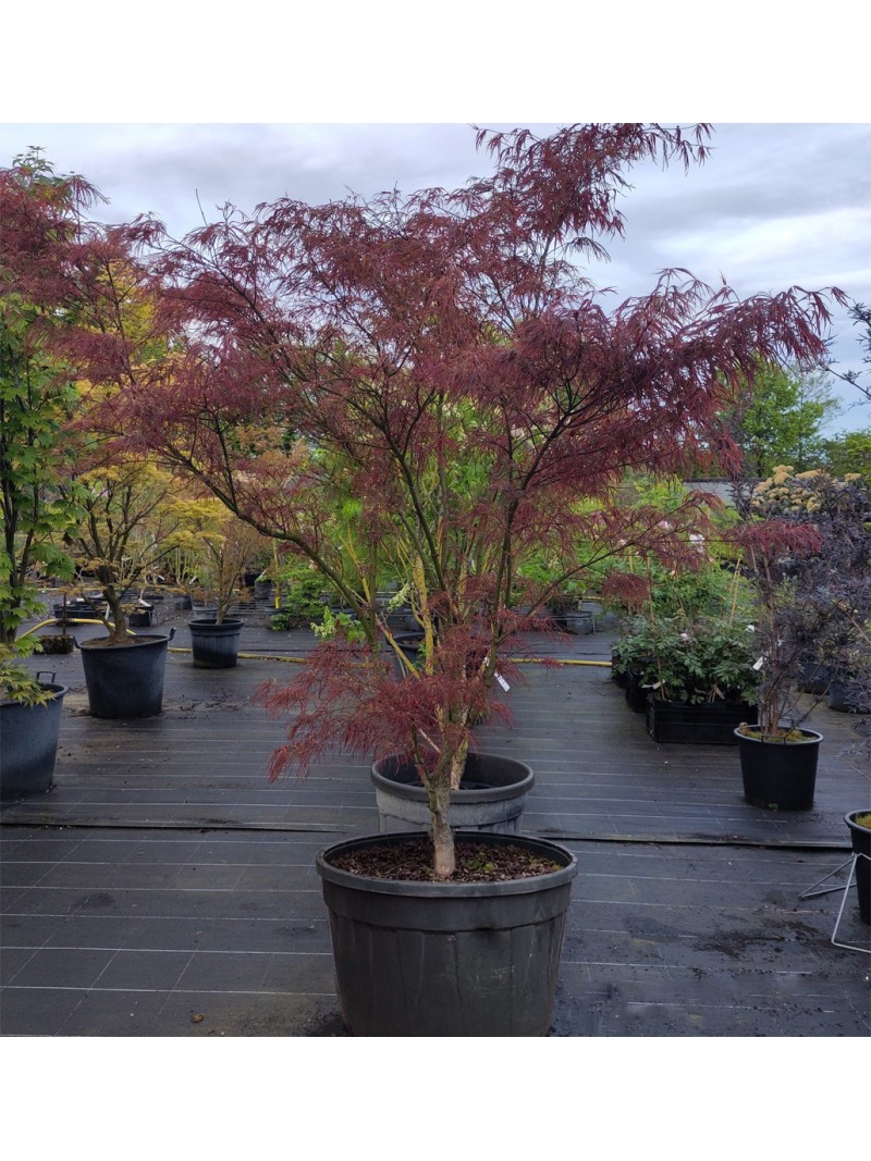 L’Acer palmatum “Red Pygmy” è una cultivar di acero giapponese appartenente alla famiglia delle Sapindaceae. Si distingue per il fogliame finemente inciso, sottile ed elegante, e per il colore rosso-bronzo che si mantiene per gran parte della stagione vegetativa. È una varietà compatta, molto apprezzata nei giardini zen e nelle collezioni di aceri ornamentali.