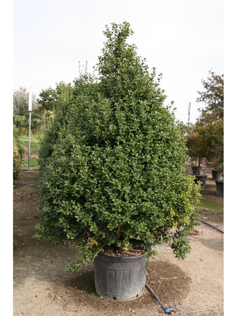 I fusti sono molto ramificati, a creare una chioma densa, i rami hanno corteccia liscia e sono di colore verde o grigio; in primavera l'agrifoglio produce piccoli fiori; trattandosi di una pianta dioica alcuni agrifogli hanno solo fiori maschili, di colore giallastro, mentre altri agrifogli hanno solo i fiori femminili, di colore bianco o rosato, riuniti in mazzetti all'ascella fogliare.