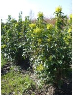 Foglie lucide tipo agrifoglio, fiori gialli primaverili, bacche blu estive. Altezza fino a 150 cm.