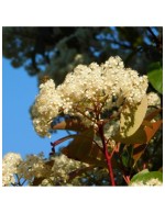 L'aspetto è arbustivo, compatto, eretto. I fiori sono piccoli, a cinque petali, riuniti in grandi infiorescenze. Fioriscono fine primavera. Le foglie sempreverdi, ovali cuoiose, di colore verde scuro, rosso porpora brillante da giovani. Raggiunge un'altezza di 5 m o più ed un diametro di 5 m. Arbusto resistente al gelo che può sopportare anche una temperatura di -5 °C.