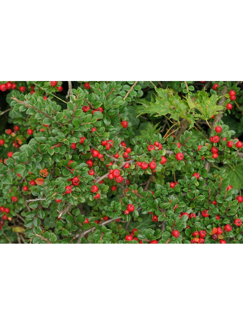 Arbusto molto rustico dal fogliame persistente verde scuro lucido, a piccole foglie ovali. Abbondante fioritura bianca in Maggio e Settembre, molto persistente durante l'inverno. Frutti globosi di 6-7 mm, color rosso corallo. Il Cotoneaster Dammeri è ideale per tutti i terreni, anche calcarei e gradisce un'esposizione al sole o a mezz'ombra.